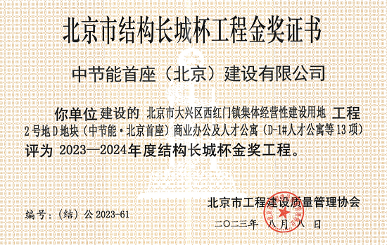 克日,,,,,中节能·北京首座项目依附卓越的结构设计、严酷的施工治理和优异的施工质量,,,,,斩获2023-2024年度(第一批)北京市修建质量最高奖项——结构长城杯金奖。。。结构长城杯是由北京市工程建设质量治理协会组织评选的工程质量奖,,,,,评选标准高于国家标准,,,,,严于相关规范、规程,,,,,获奖工程必需是内外兼修的精品结构工程。。。
