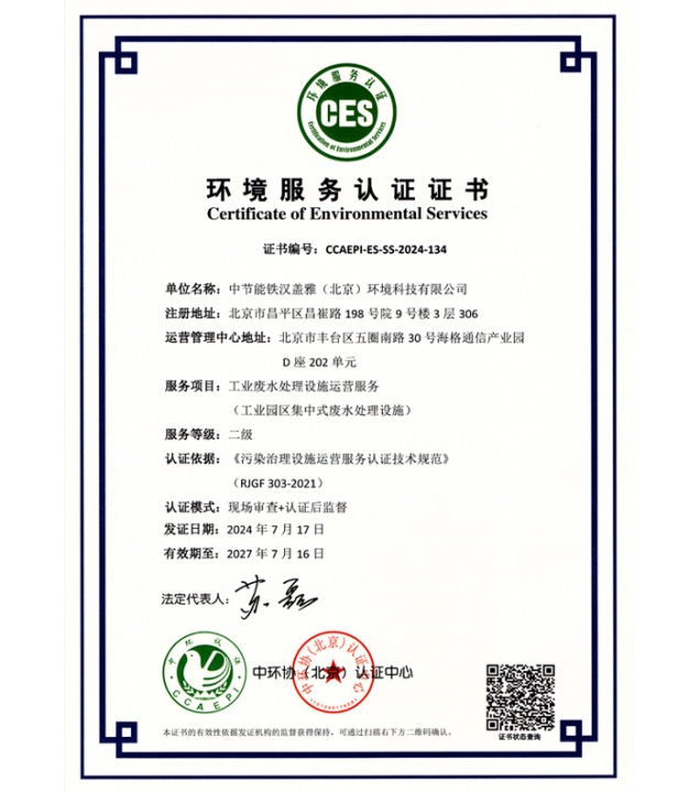 【提质增效年】中节能铁汉所属铁汉盖雅取得工业废水处置惩罚设施运营效劳二级认证证书 |